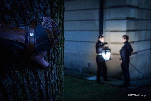 Istota z cienia rozejrzała się spokojnie po pustej ulicy i wyciągnęła rękę w górę. Z cichym syknięciem w powietrze wystrzelił dziwaczny przedmiot, przypominający po części kotwicę, a po części małą maczugę. Wbił się w zwieńczenie muru, a smukła postać błyskawicznie wspięła się na niego, wspomagana ściągającą się automatycznie metalową linką.