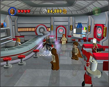 Gdy to zrobimy, powracamy na stare śmieci w trybie „Free play”. Tym razem możemy dowolnie ustalić skład naszej drużyny. Ma to fundamentalne znacznie dla gry, jako że każdy legoludek ma unikalną (no, niektóre się powtarzają) dla niego umiejętność, która umożliwi nam dotarcie w miejsca niedostępne przy poprzednim podejściu, np. znane ze „starej” trylogii otwieranie drzwi przez R2-D2, bądź też umiejętność używania Mocy na specjalnych, „mrocznych” przedmiotach w wykonaniu Ciemnych Jedi. To właśnie stanowi o sile gry, ta nieodparta pokusa powrotu do uprzednio ukończonych etapów, celem znalezienia wszystkich bonusów i dodatków. A mamy ich przecież całą masę. Przez cały czas trwania gry kompletujemy naszą galerię lego-pojazdów, zdobywamy bonusowe postacie oraz zbieramy pieniądze na wykupienie rozbrajających cheatów (takich, jak dość absurdalne wąsy przyczepione wszystkim postaciom – hue, hue, hue). To, co na Zachodzie nazywają „replay value”, czyli zdolność gry do zachęcenia nas do powtórnego jej ukończenia, stoi tutaj na niespotykanie wysokim poziomie.