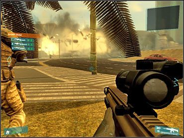 Przy okazji zwrócę jeszcze uwagę na wyśmienicie zrealizowane eksplozje, a także ładną animację ruchomych jednostek. Widok zgniatającego zaparkowany wóz czołgu, który jednocześnie zmierza w stronę naszej drużyny musi wywoływać ogromne wrażenie. Przyczepić muszę się jedynie do wspomnianych już wcześniej zachowań członków drużyny, którym od czasu do czasu zdarza się zacinać na elementach otoczenia. Bardzo fajnie wykonano fizykę świata gry, nawet jeśli nie posiada się karty firmy AGEIA. Widać to w szczególności na przykładzie często spotykanych drewnianych płotków, za którymi nie warto nawet próbować się ukrywać. :-)
