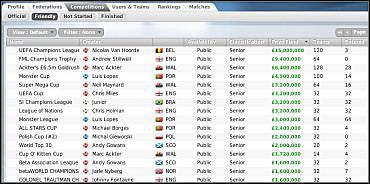 Przejdźmy do sedna sprawy, czyli rozgrywki. Aby zdobyć pieniądze na pensje, należy brać udział w turniejach oraz ligach. Tworzą je sami gracze! Znudziła wam się Liga Mistrzów i Puchar UEFA? Nic straconego. Nagrody w takich eventach jak „Hulk Hogan Cup” skutecznie przyciągają rzesze użytkowników. Aby zarobić jakiekolwiek pieniądze, należy najpierw wrzucić pewną kwotę do puli ogólnej i zajść na tyle wysoko, aby zyski przewyższyły wydatki. Nie jest to łatwe, gdyż to gracze ustawiają wysokość nagrody na wybranych etapach zawodów. Często zdarza się, że przed stratą finansową ratuje nas jedynie półfinał rozgrywek pucharowych. Z pomocą przychodzą również federacje zawiązywane w wyniku masowych porozumień między użytkownikami. Tu również należy liczyć się z pewnym wkładem finansowym. W zamian otrzymujemy premie z transmisji w telewizji.
