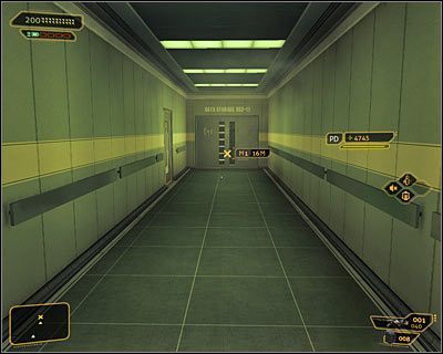 Skorzystaj z północnego wyjścia z pomieszczenia przetwarzania danych #1. Korytarz zakręca w tym miejscu na zachód #2. Jeżeli wyłączyłeś kamery, to nie masz się tu czego obawiać. W przeciwnym wypadku musiałbyś umiejętnie zbliżyć się do nowej kamery ochrony i pod nią przejść.