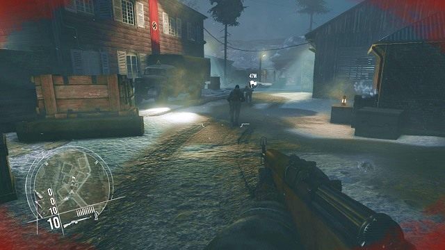 Po oczyszczeniu terenu nasza kompania rozdzieli się na 2 grupy. Jedna z nich ruszy w swoim kierunku, natomiast nasza -do której należy 2 zwykłych bojowników - będzie musiała podążać za wskaźnikiem celu misji. W takim razie biegiem! Zanim na dobre zapuścimy się w dalsze rejony bazy warto wstąpić do pierwszego napotkanego budynku za mostem, a mianowicie tego ozdobionego flagą ze swastyką, gdyż wewnątrz w jednym z pomieszczeń znajdziemy 1 z 4 sekretów leżący na stole tuż obok maszyny do pisania.
