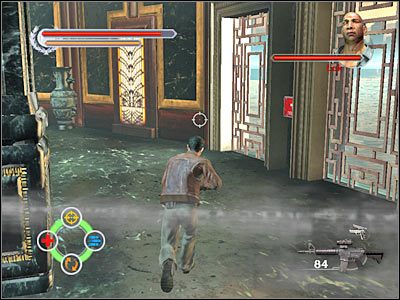 1) Absolutnie nie wchodzi tu w rachubę skrywanie się. Tyczy się to zarówno słupów, jak i górnych balkoników. Boss dysponuje bardzo dobrym karabinem, który w mig "poszatkuje" takie zasłony.