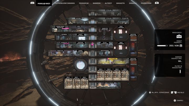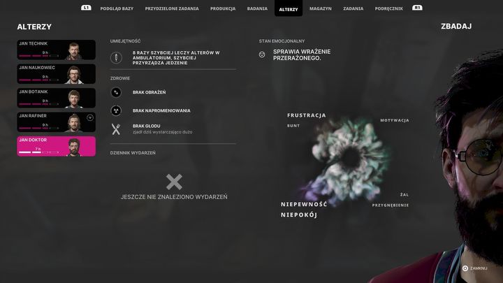 Jeśli szykujecie się już na gromadzenie stimpaków i innych antyradów, to nic z tych rzeczy: przebywając w bazie, alterzy i Jan automatycznie powoli wracają do zdrowia. Podobnie jedzenie ogranicza się do konieczności zapewnienia jednego posiłku dziennie (można co najwyżej wybrać jego jakość), przy czym sam Jan najwyraźniej jeść nie potrzebuje w ogóle, bo pilnować musi tylko wskaźnika radiacji.