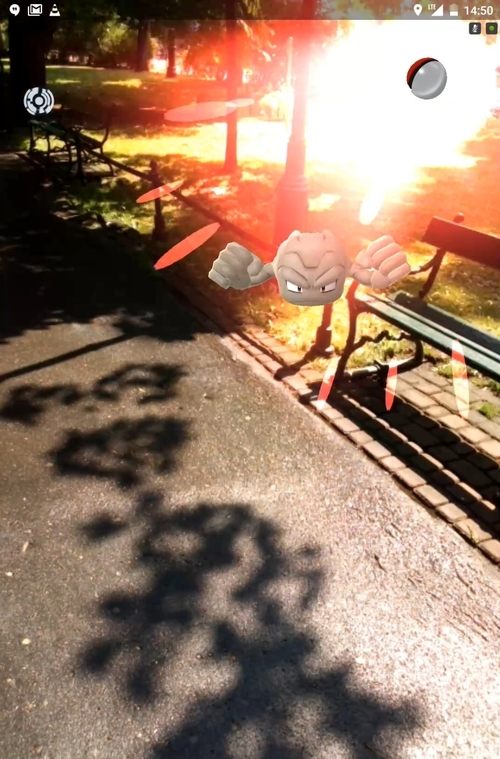 Gdy rozpoczyna się proces łapania stwora, aplikacja pokazuje obraz z kamery urządzenia wzbogacony o hasającego pokemona. Odpowiednia zręczność i trafienie w zmieniającą objętość obręcz wokół stworzenia kończą się schwytaniem go i dodatkową premią za celność. Jeśli jednak nie podoba nam się taki zabieg, możemy szybko wyłączyć alternatywną rzeczywistość, a napotkany stworek przeniesiony zostanie do wirtualnego świata z określonym tłem. Gra niestety nie tłumaczy dobrze mechaniki łapania – a o samym podkręcaniu pokeballi, które niesie ze sobą znaczące premie, dowiemy się od kolegi, który przypadkiem na to wpadł, lub z internetu.