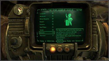 Naramienny komputer posiada trzy główne działy: Stats, Items oraz Data. W tym pierwszym możemy oczywiście przeglądać parametry systemu S.P.E.C.I.A.L, perki oraz punkty umiejętności. W tych ostatnich nie znalazłem niczego zaskakującego, jest w sumie po staremu. Trzy skille odpowiadające za zdolność posługiwania się bronią: small guns, big guns, energy weapons, a do tego oczywiście explosives, melee i inne takie. Poza tym, całkiem sporo tu umiejętności nie związanych z walką: speech, barter, science i tak dalej. Ogólnie zaryzykowałbym stwierdzenie, że lista umiejętności jest skopiowana jeden do jednego z poprzednich gier.