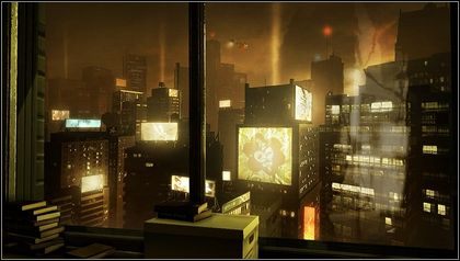 Na początku przez kilkanaście sekund mogliśmy podziwiać ulice Detroit A.D 2027. Choć pod względem technologicznym gra nie zachwyca, to projekty lokacji i brudna kolorystyka na pewno przypadną do gustu miłośnikom mrocznego science fiction. Po chodniku błąkają się przechodnie, nieopodal posterunku policji bezdomni ogrzewają się przy prowizorycznym ognisku. Ulice rozświetlane są przez wszechobecne billboardy, a nad drapaczami chmur rozciąga się futurystyczna miejska kolejka. Deweloper zwraca naszą uwagę na wieżowiec w oddali, w którym znajduje się apartament sterowanego przez nas Adama Jensena.