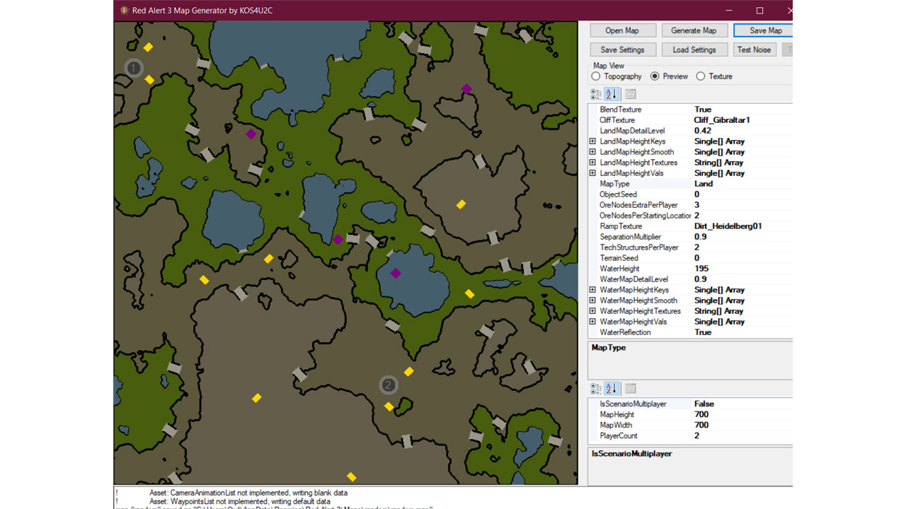 To generator map, które może tworzyć mapy lądowe/wodne dla 1–6 graczy oraz mapy turniejowe dla 2/4/6 graczy (mapy symetryczne).