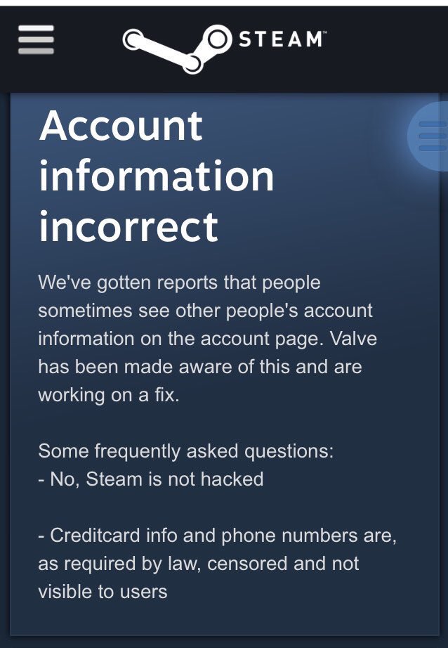 To, prawdopodobnie, problem z cache na ich serwerach. Nikt nie jest zalogowany na inne konto, ani nikt nie jest zalogowany na nasze. Steam nie został zhakowany. Wyciekły (bo widoczne są) tylko (albo aż) adresy email, email paypalowy (jeśli jest), ostatnie cztery cyfry karty i telefonu.