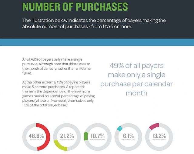 W styczniu 2014 roku blisko 49% płacących dokonało tylko jednej transakcji, z kolei na co najmniej pięć zakupów w tym samym miesiącu zdecydowało się tylko 13,2% osób uiszczających opłaty. Wygląda też na to, że twórcom gier mobilnych opłaca się umieszczać mikropłatności na wysokim pułapie cenowym. Mimo, że w styczniu 2014 roku zaledwie 0,7% zakupów przekroczyło 50 dolarów, to ogólnie przełożyło się to na 9% ogólnych przychodów z tego miesiąca. Z kolei wydatki na poziomie od 1 do 5 dolarów reprezentują większość (67%) wszystkich transakcji, ale dają one tylko 27% całkowitych przychodów.