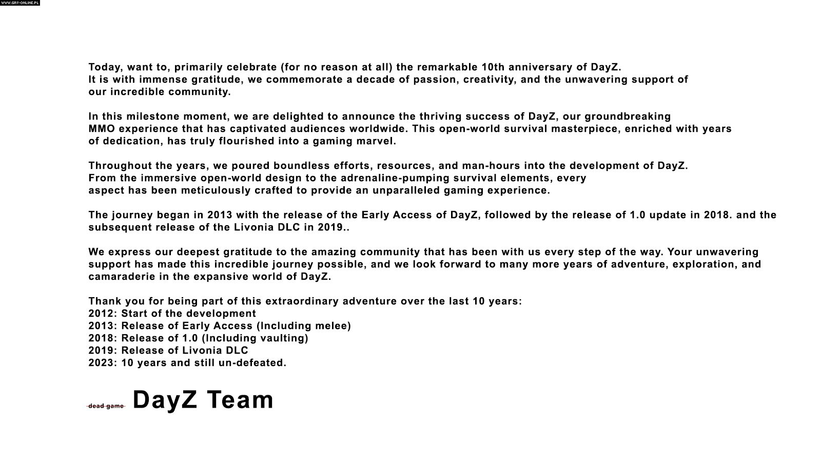 Na końcu wiadomości twórcy umieścili listę z kilkoma przełomowymi datami z historii DayZ, wieńcząc ją 2023 rokiem i dopiskiem: „10 lat i wciąż niepokonani”. To również odniesienie do wspomnianego komunikatu Fntastic, w którym studio wymieniło tytuły, jakie zdążyło wydać.