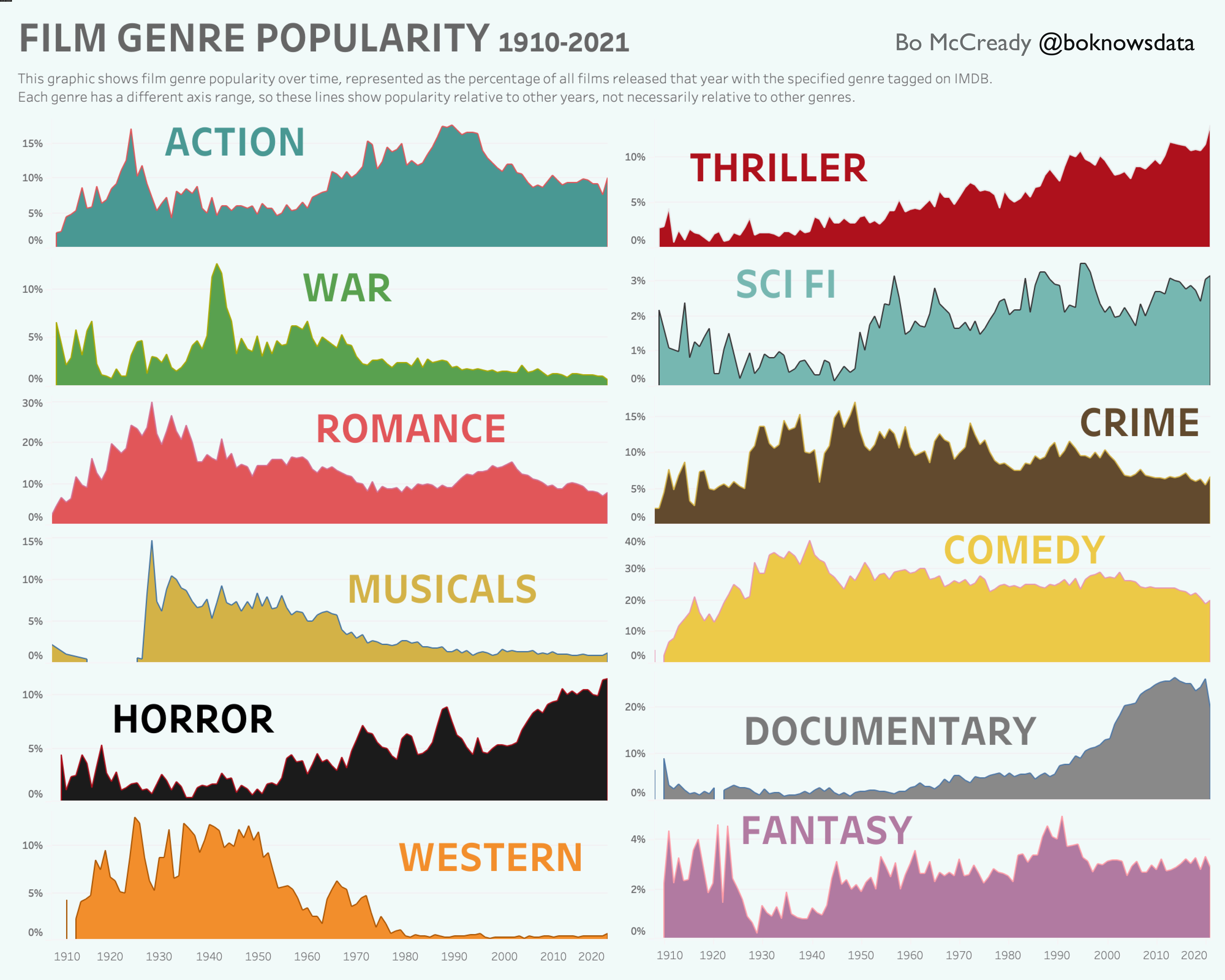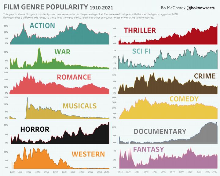 Użytkownik o nicku Bo McCready postanowił, że jego działalność zaliczać się będzie do tej drugiej kategorii. Przygotował bowiem infografikę, na której możemy prześledzić, jak w poszczególnych latach od 1910 do 2021 roku prezentowała się popularność konkretnych gatunków filmowych.