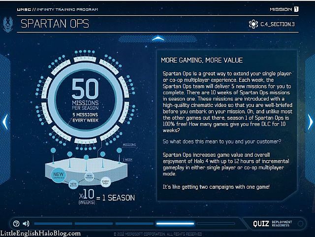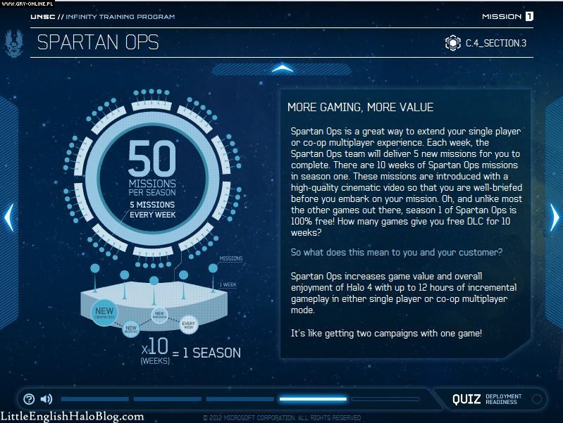 Dowiedzieliśmy się w ten sposób między innymi, że po premierze Halo 4 twórcy będą udostępniać nowe misje do trybu Spartan Ops. Wypuszczanych będzie po 50 zadań na sezon, a każdego tygodnia otrzymamy pięć z nich. Oznacza to dziesięć cotygodniowych aktualizacji przypadających na jeden sezon. Misje będą poprzedzane filmem przerywnikowym, który odpowiednio wprowadzi graczy do akcji.