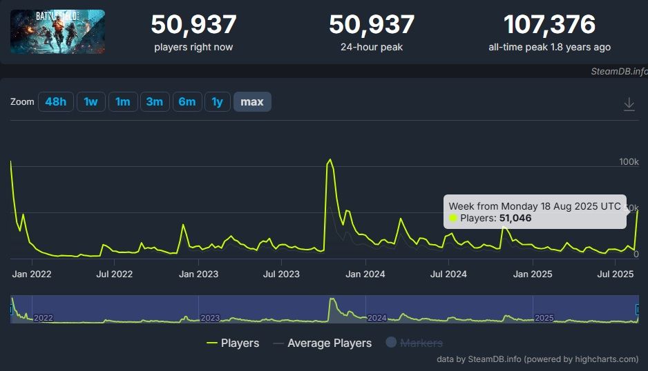 Spora aktualizacja o numerze 9.2 przyciągnęła masę osób do krytykowanego tytułu. W dniu, w którym wystartowała promocja, w Battlefieldzie 2042 na Steamie bawiło się jednocześnie ponad 51 tys. osób (via SteamDB). Zaznaczmy, że do jej rozpoczęcia średnio w produkcję grało od kilku do kilkunastu tysięcy osób w tym samym momencie.