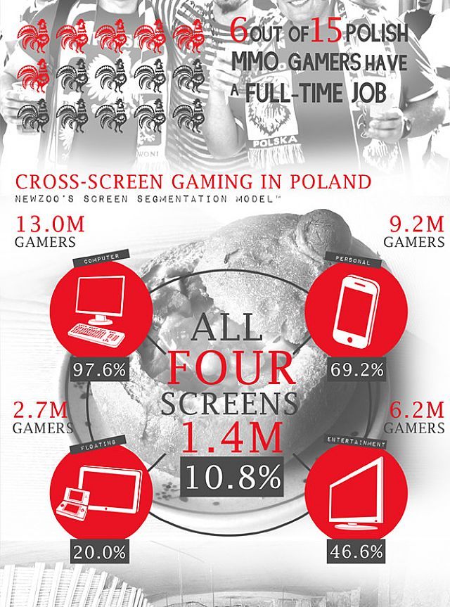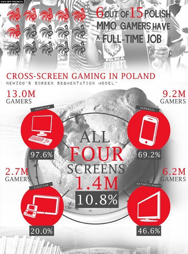 Rodzimi gracze zostali dodatkowo podzieleni na kategorie związane z urządzeniami i rodzajem gier, które preferują. Z pecetów do grania korzysta 9,6 miliona osób. Warto tu zaznaczyć, że z przyczyn biznesowych do tej grupy nie zalicza się miłośników MMO oraz gier społecznościowych/przeglądarkowych. Z tytułami MMO bawi się więc 6 milionów Polaków, a z produkcjami casualowymi i społecznościowymi aż 12 milionów (łącznie na wszystkich platformach sprzętowych). Konsole stacjonarne posiada 6,2 miliona rodaków, natomiast przenośne 1,1 miliona. Do zabawy z grami wykorzystywane są także urządzenia mobilne. 5,6 miliona osób lubi grać na smartfonach, a 1,9 miliona na tabletach.