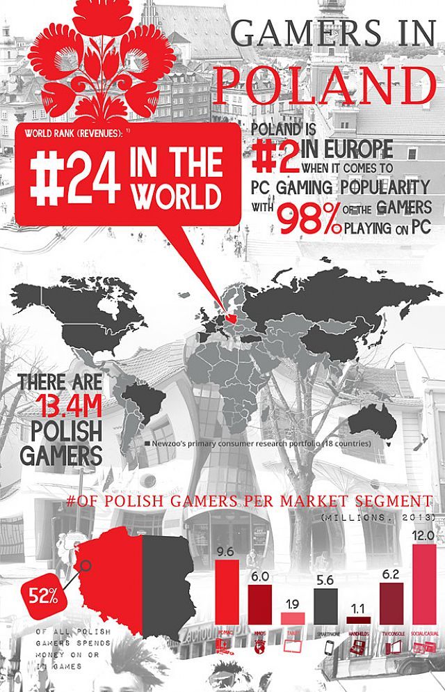 Według Newzoo, w 2013 roku w kraju było w sumie 13,4 miliona graczy. 98% z nich bawi się (nie wykluczając przy tym innych platform) wykorzystując do tego komputer PC lub MAC. Spośród przebadanych krajów zajmujemy pod tym względem drugie miejsce w Europie (na infografice państwa te są zaznaczone ciemniejszym kolorem).