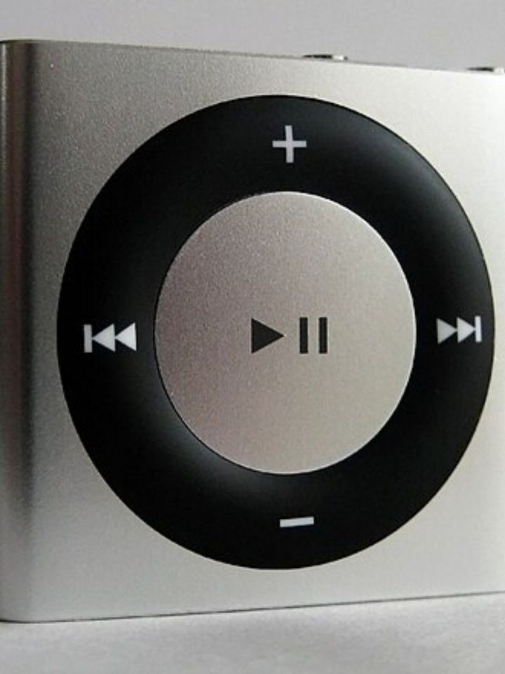Podpis: Pierwsza wersja iPoda Shuffle przypominała przerośniętego pendrive’a. Była biała, plastikowa i miała 512 MB lub 1 GB. To było nowe podejście do prostego i taniego odtwarzacza muzyki.Źródło: Wikipedia.