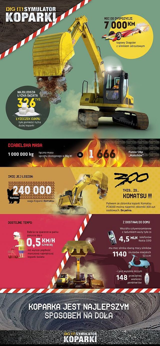 Dig It! Symulator Koparki miał premierę w połowie kwietnia, zyskując niezwykle pozytywny odzew wśród miłośników symulatorów. Wszystko wskazuje na to, że w swojej kategorii, Dig It! Symulator Koparki jest największym odkryciem 2015 roku. Zachęceni tak pozytywnym odbiorem, przygotowaliśmy specjalną infografikę, obrazującą niektóre aspekty związane z takimi maszynami.