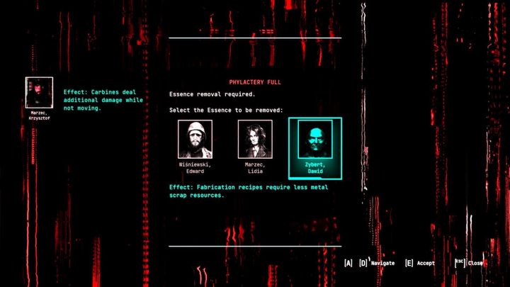 Każda esencja oferuje pasywny bonus do statystyk. Musicie tu radzić sobie ze sporym utrudnieniem, bo pozyskanie nowej esencji oznacza konieczność trwałego usunięcia jednej z aktualnie posiadanych. Nie możecie jej tymczasowo wyłączyć. Raz usunięta bezpowrotnie przepadnie. Pierwszego wymuszonego usunięcia esencji doświadczycie w ramach fabuły. W przypadku kolejnych esencji możecie ignorować dodawanie nowych, jeśli jesteście zadowoleni z aktualnie używanych.