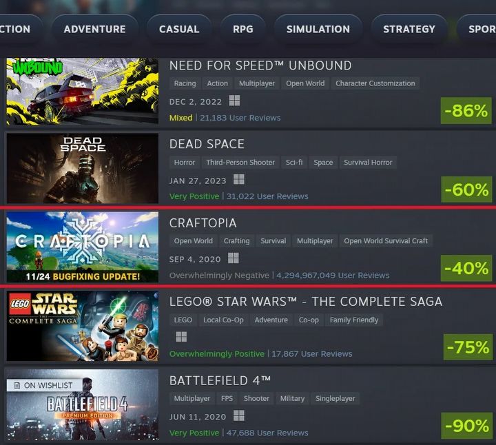 Oczywiście to tylko absurdalny błąd na Steamie, który mocno zdziwił i rozbawił internautów. W rzeczywistości Craftopię oceniło mniej niż 20 tysięcy użytkowników. Niemniej przez krótki czas po wejściu na stronę Ofert specjalnych można było zauważyć, że przygodowo-survivalowa gra akcji twórców Palworld została oceniona przez prawie 4,3 miliarda użytkowników platformy firmy Valve – czyli ponad połowę łącznej populacji Ziemi. Ten „rekord” zauważył użytkownik u/Regzato z serwisu Reddit.