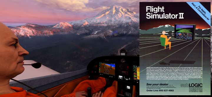 Mt. Rainier – to samo miejsce w reklamie gry z 1984 roku i w obecnej odsłonie.Microsoft Flight Simulator 2024, Xbox Game Studios, 2024/Flight Simulator 2.0, Microsoft, 1984.