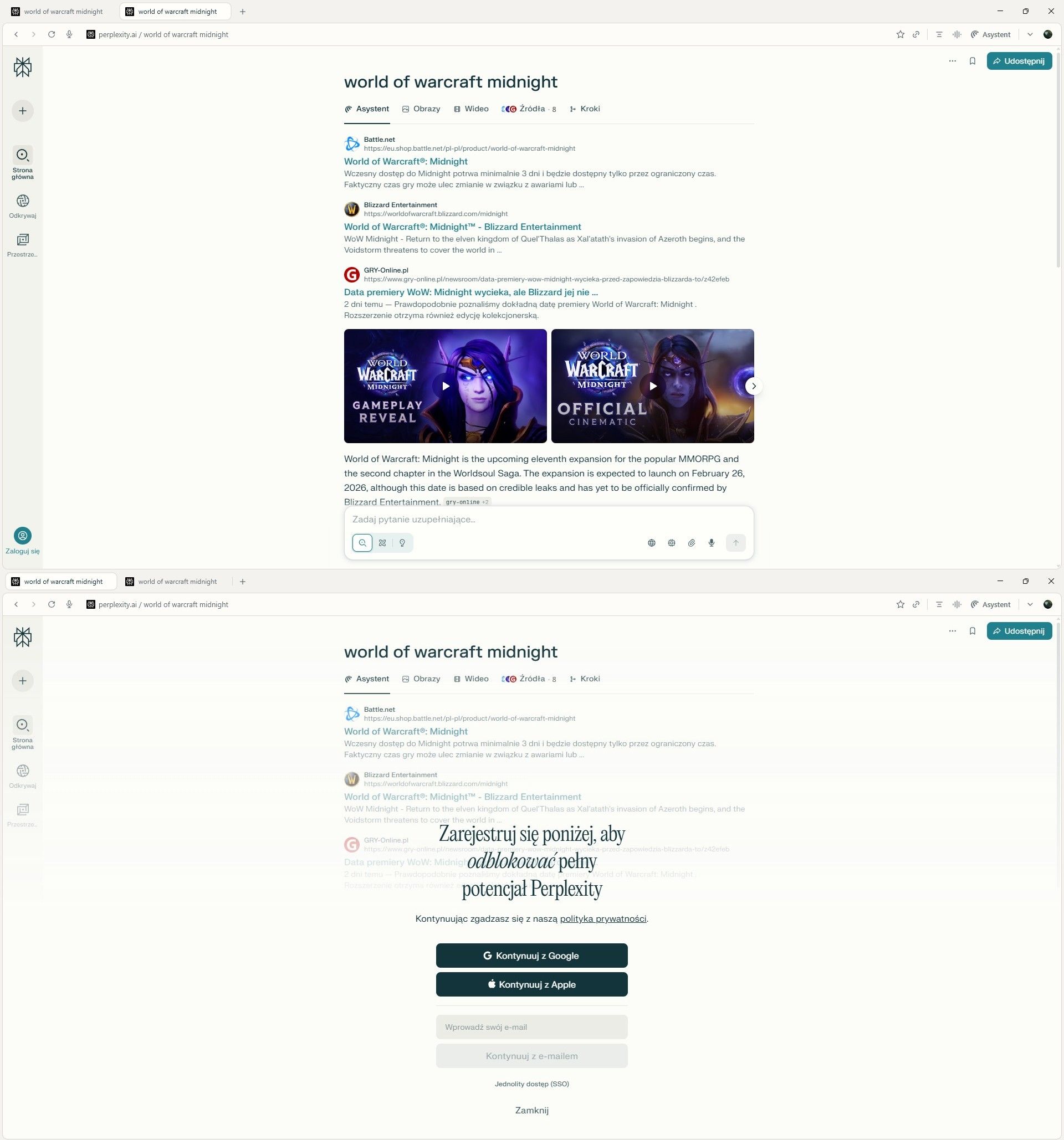 Nie możemy jednak w pełni używać Perplexity Comet AI, jeśli nie zalogujemy się na konto Google, Apple lub mailem. Bez tego możemy korzystać z przeglądarki, ale wydaje się, że jest limit wyszukań na daną kartę przeglądarki. Podczas naszych testów, gdy wyświetlił się komunikat, wpisanie nowego zapytania nie usuwało go. Wystarczyło otworzyć nową kartę w przeglądarce, żeby informacja o logowaniu nie przeszkadzała.