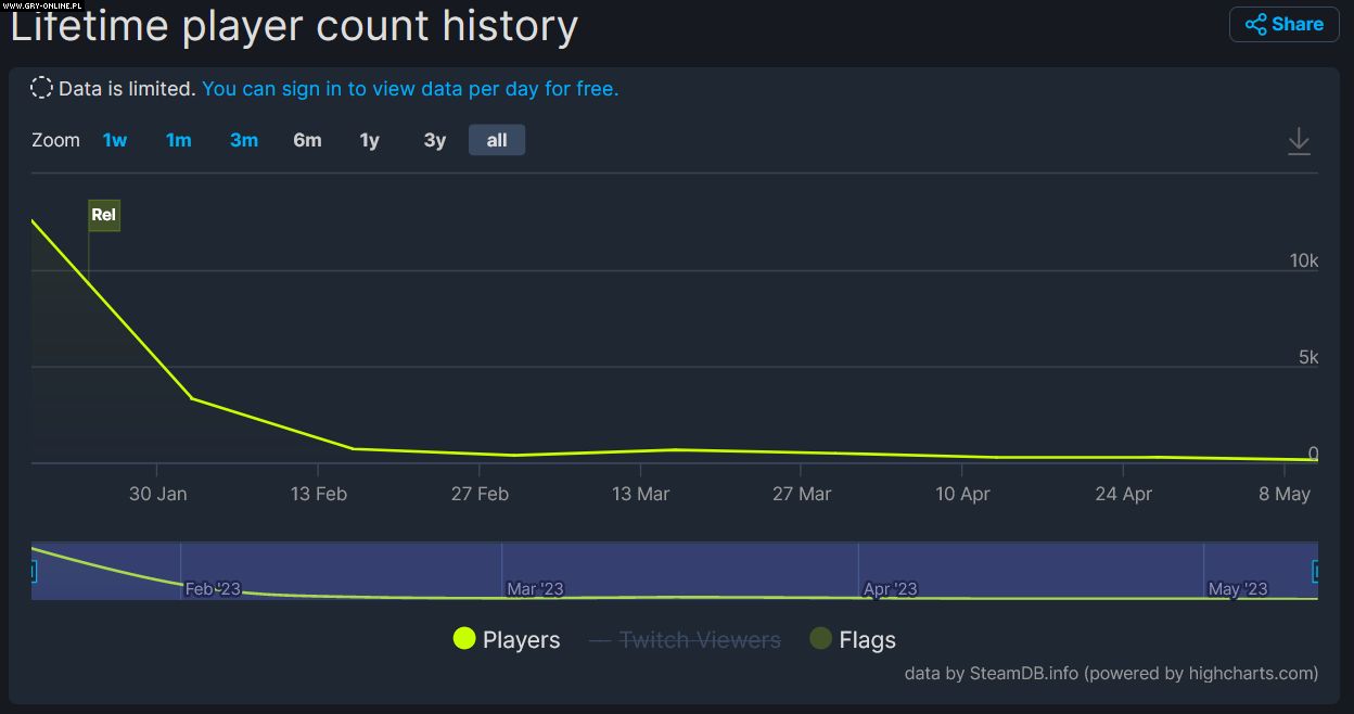 Słabe recenzje prasy, opinie graczy (52% pozytywnych opinii na Steam) oraz kiepska wydajność wersji PC sprawiły, że Forspoken zaczęło w zastraszającym tempie tracić graczy.