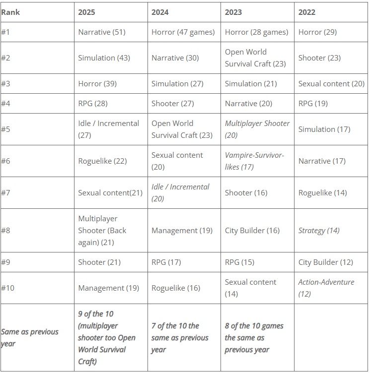 Wypada przy tym dodać, że Zukowski starał się przydzielać każdy tytuł tylko i wyłącznie do jednej kategorii. Oczywiście ma to swoje wady, także dlatego, że przy 20 tysiącach tytułów musi opierać się na tagach Steama, a te potrafią być zawodne. Analityk korzystał z kombinacji tych oznaczeń, by łatwiej zidentyfikować faktyczny gatunek. Na przykład za RPG uznał tytuły, które miały zarówno Tag „RPG”, jak i „bogata fabuła”. Dlatego akurat na tę tabelę wypada patrzeć z przymrużeniem oka.