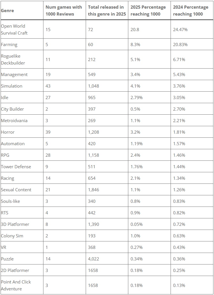 W tym zestawieniu najgorzej wypadają gry logiczne, bo choć 14 z nich zdołało dobić do 1000 recenzji, wymagało to poświęcenia ponad 4 tysięcy gier z tego gatunku. Dla porównania: taki sam sukces odniosło 15 sandboxowych survivali, tyle że łącznie ukazało się ich mniej niż 100.