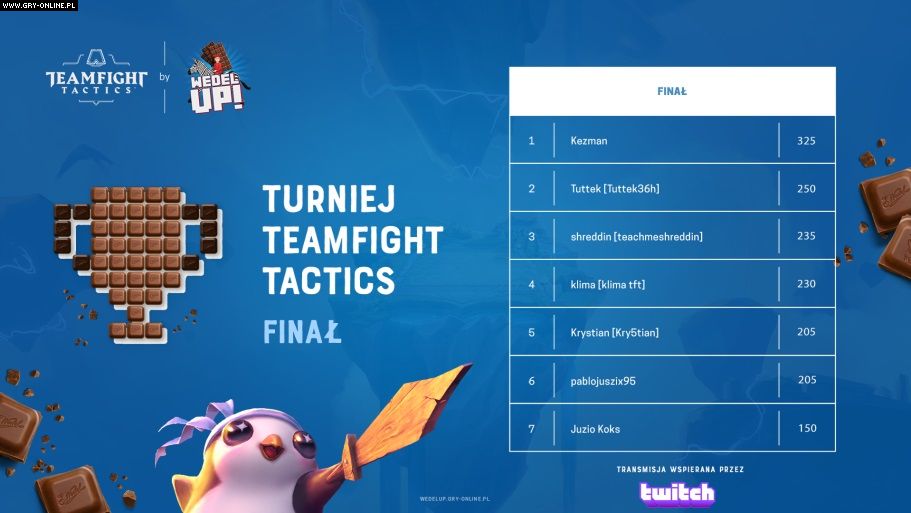 Wczoraj odbył się wielki finał turnieju Teamfight Tactics CUP by Wedel Up!, który zorganizowaliśmy dla Was wraz z marką E.Wedel oraz firmą Riot Games. Osiem pojedynków wyłoniło zwycięzcę, który zgarnął nagrodę główną w postaci 8 000 złotych oraz ważącej prawie 10 kilogramów czekoladowej statuetki ptasiego rycerza Pingu.