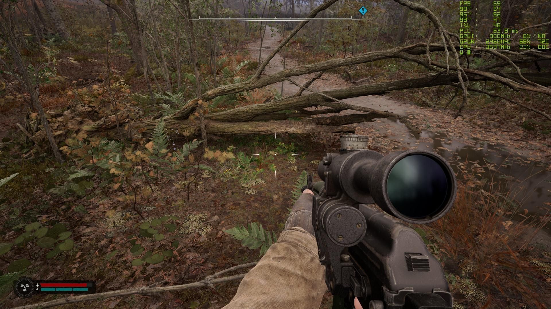 Stalkera 2 przetestowałem na domyślnych, wysokich ustawieniach detali. Wybrałem losowe miejsce w terenie, gdyż wizyta w hubach – bazach, jak wioska Zalesie z początku gry, generuje nieusprawiedliwione, zaskakująco duże spadki.