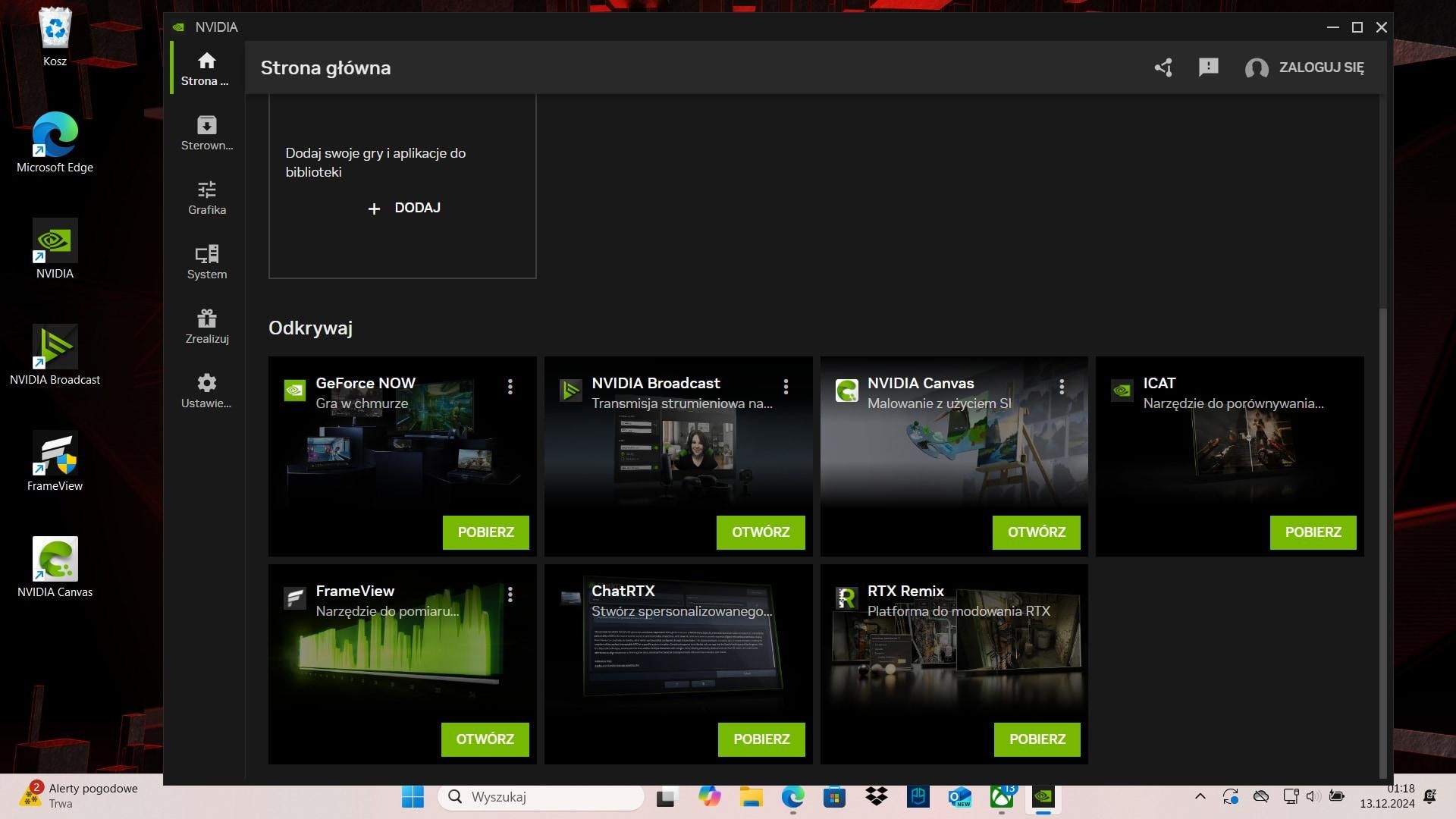 NVIDIA App pozwala na szybką instalację dodatkowych składników, czyli aplikacji w głównej aplikacji. Wśród nich jest znane dobrze GeForce Now do grania w chmurze, NVIDIA Canvas do malowania tła i krajobrazów z pomocą AI, licznik klatek FrameView czy NVIDIA Broadcast przeznaczona dla streamerów. Acer Nitro 5 jest wyposażony standardowo w kamerkę i mikrofon, jednak jakość transmisji z nich nadaje się bardziej do korporacyjnych video konferencji niż streamowania.