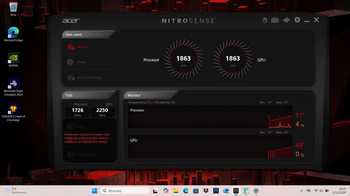 Przy kolejnych uruchomieniach po zakończeniu personalizacji, system Windows 11 jest w zasadzie błyskawicznie gotowy do pracy po wciśnięciu przycisku zasilania. Komputer ma preinstalowane małe centrum sterowania od Acera o nazwie Nitro Sense. To aplikacja pozwalająca monitorować obciążenie procesora i karty graficznej, sterować obrotami wentylatorów oraz podświetleniem RGB. Zaskoczyło mnie, jak schludnie i czytelnie zaprojektowano jej interfejs. Nie przytłacza nas ilością opcji, wszystko jest łatwo dostępne i intuicyjne.