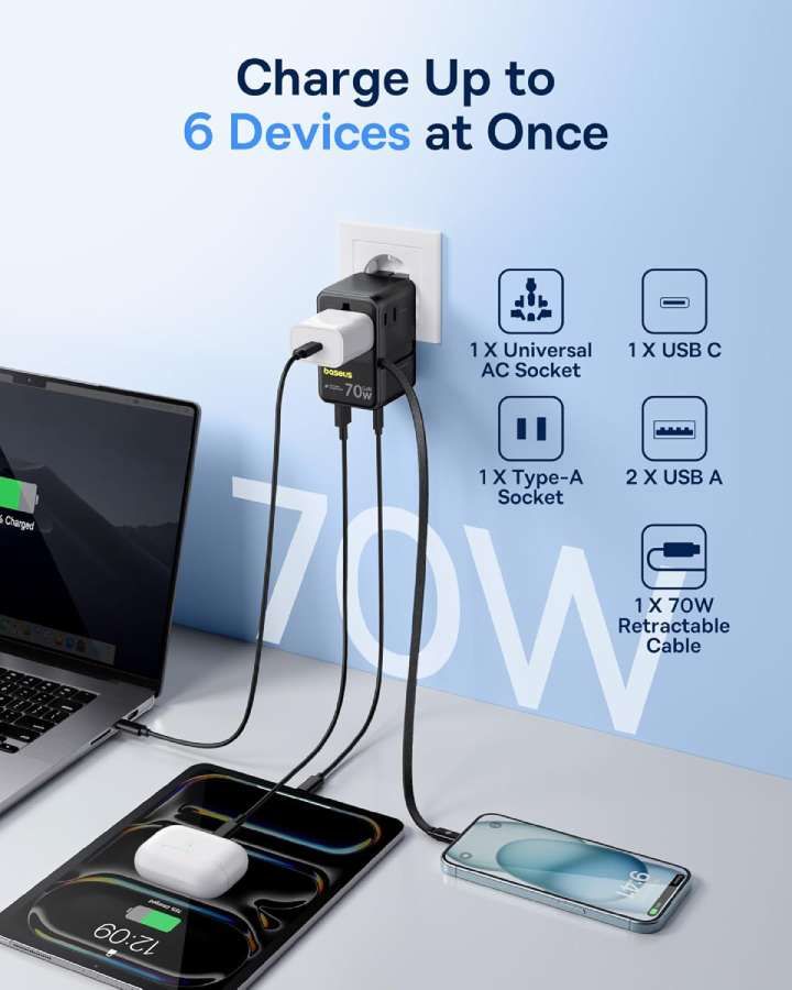 Użyłem tego adaptera Baseusa podczas weekendu we Francji i Londynie i było to bardzo wygodne. Za pomocą jednego urządzenia naładowałem iPhone, telefon z Androidem i iPad równocześnie, bez żadnych problemów. Jest kompaktowy, solidny, a międzynarodowe wtyczki sprawdzają się na całym świecie.