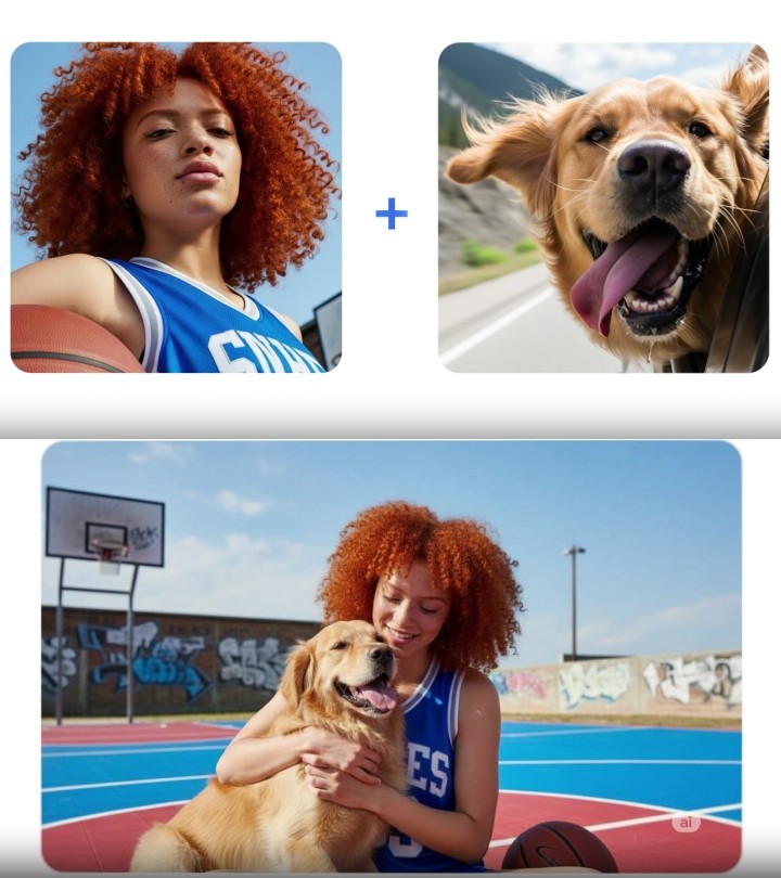 Dodatkowo Gemini 2.5 Flash ma być zdolne do łączenia kilku fotografii w jeden obraz. Jako przykład pokazano niepowiązane ze sobą zdjęcia kobiety i psa. Następnie wykorzystano prompt, nakazujący sztucznej inteligencji wygenerowanie obrazu, na którym kobieta przytula psa na boisku. Pokazuje to spore możliwości, jakie daje „nano banana”, chociaż prawdopodobnie są one zarezerwowane dla płatnych wersji modelu.