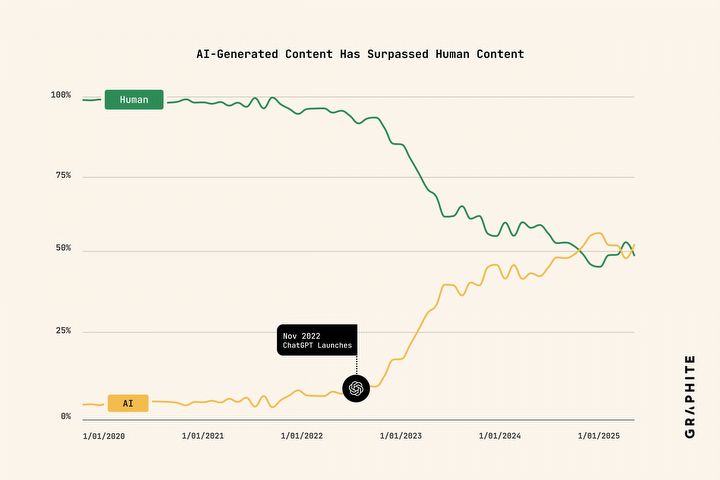 Przewaga 52% do 48% jest niewielka i zdaniem badaczy utrzymuje się od końca listopada 2024 roku. Oznaczałoby to dużą stagnację w porównaniu z wcześniejszym gwałtownym wzrostem. Jako powód podaje się to, że firmy zorientowały się, iż teksty generowane przez AI nie osiągają tych samych wyników, co autorskie treści przygotowane przez człowieka.