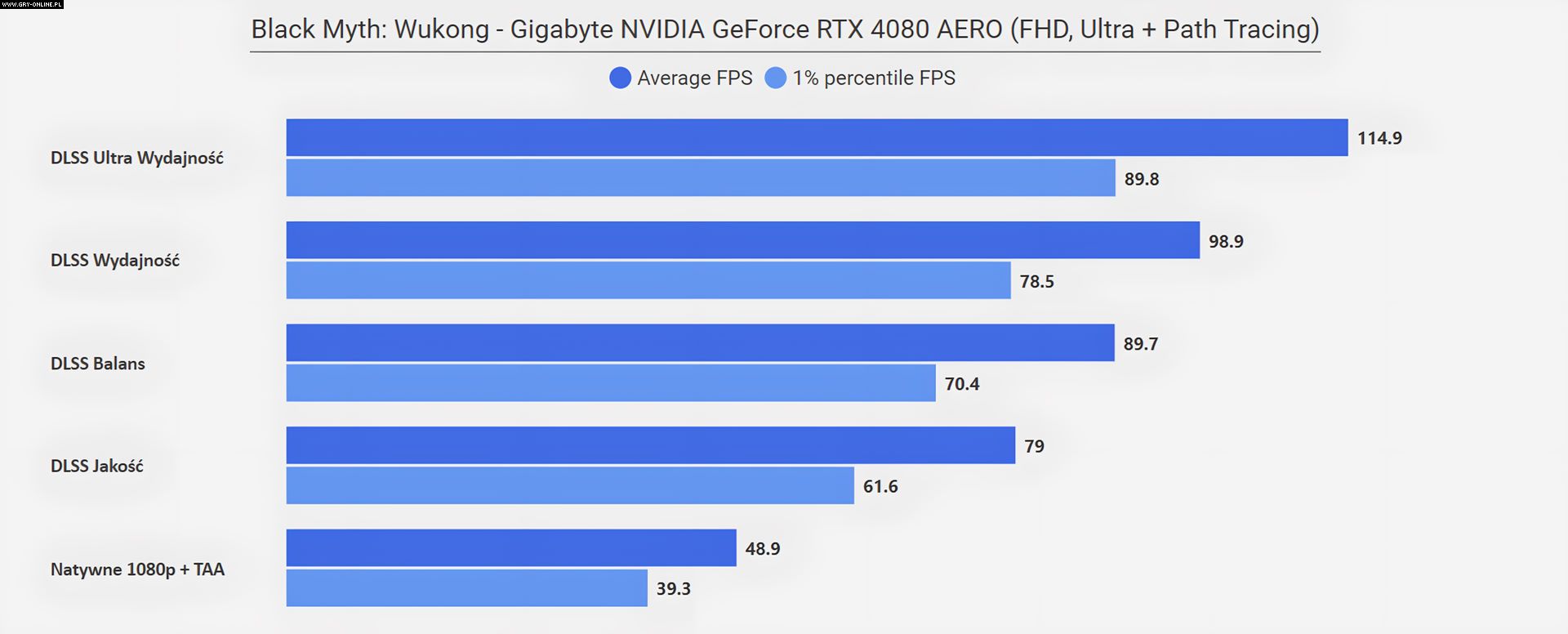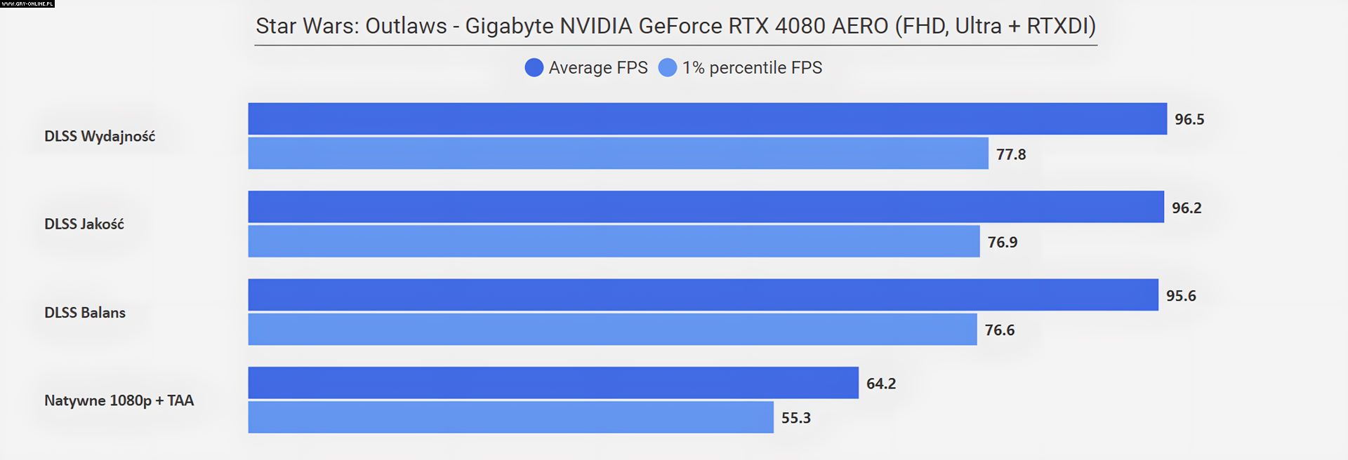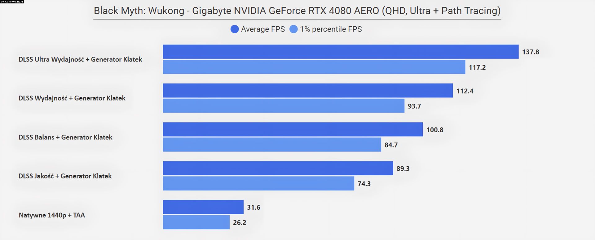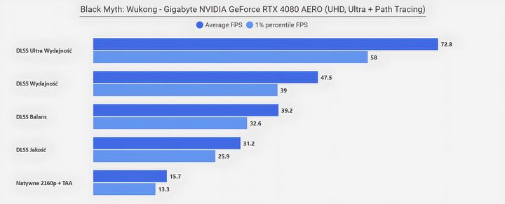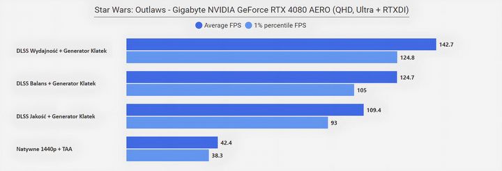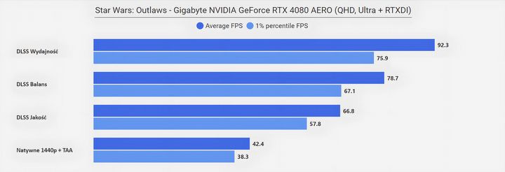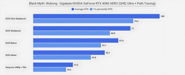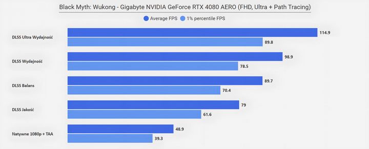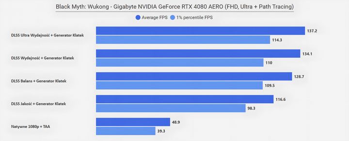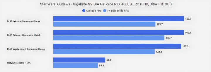 Jeżeli zastanawia was „co się stało w rozdzielczości FHD”, że wszystkie poziomy DLSS dają ten sam rezultat, to już wyjaśniam – w tym przypadku limitem wydajności okazał się procesor (AMD Ryzen 7950X3D)… Zwyczajnie w tym miejscu testowym CPU nie jest w stanie wystarczająco szybko dostarczać informacji dla karty graficznej, na co rozwiązaniem jest aktywowanie Generatora Klatek z DLSS 3.0, który to dodatkowe FPS generuje bezpośrednio na samej karcie. Efekt mówi sam za siebie.