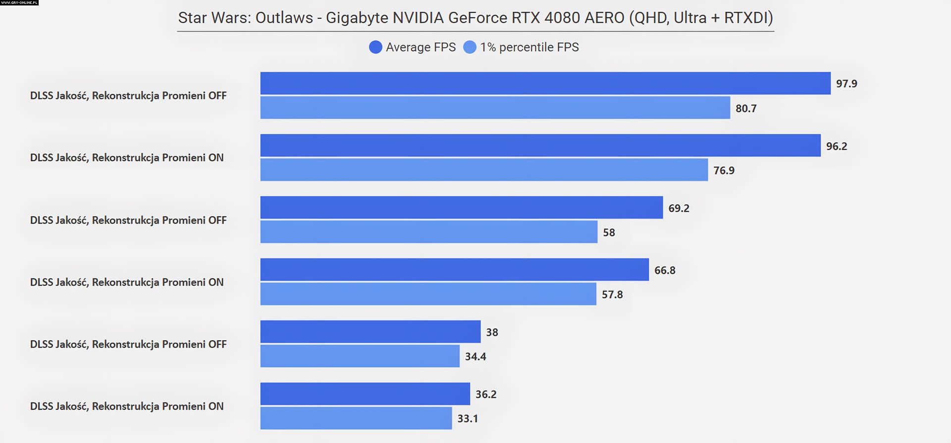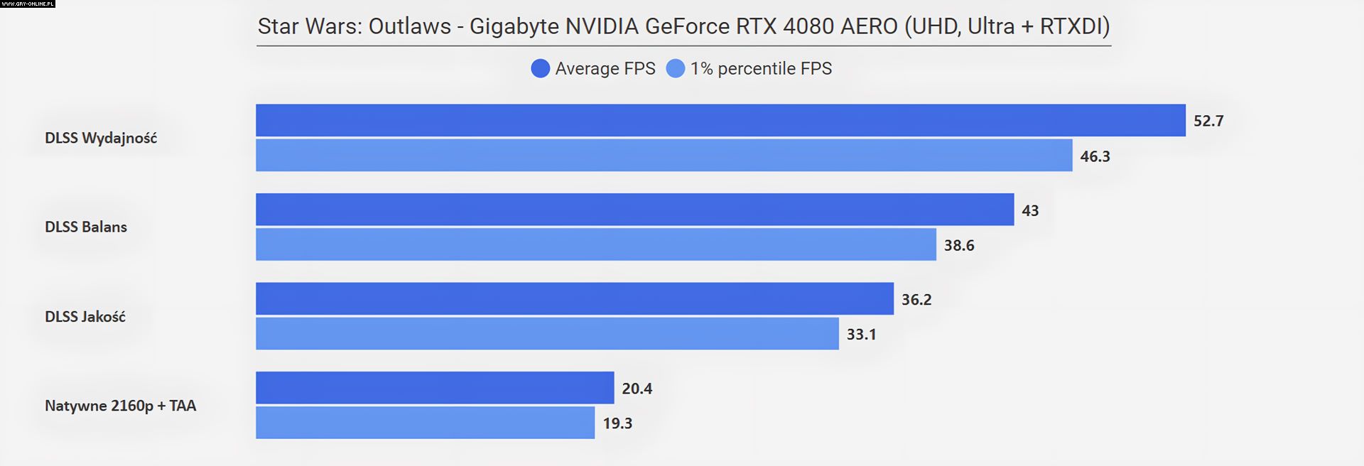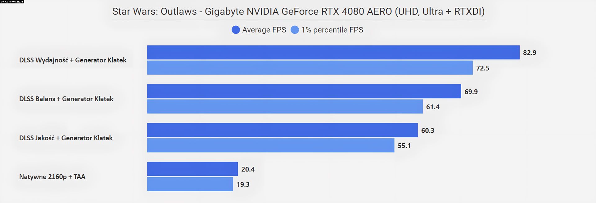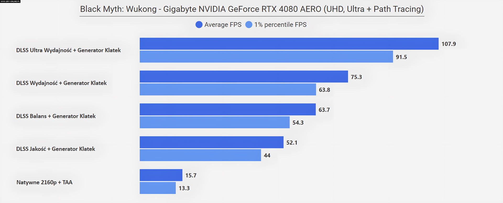 Jeżeli zastanawia was „co się stało w rozdzielczości FHD”, że wszystkie poziomy DLSS dają ten sam rezultat, to już wyjaśniam – w tym przypadku limitem wydajności okazał się procesor (AMD Ryzen 7950X3D)… Zwyczajnie w tym miejscu testowym CPU nie jest w stanie wystarczająco szybko dostarczać informacji dla karty graficznej, na co rozwiązaniem jest aktywowanie Generatora Klatek z DLSS 3.0, który to dodatkowe FPS generuje bezpośrednio na samej karcie. Efekt mówi sam za siebie.