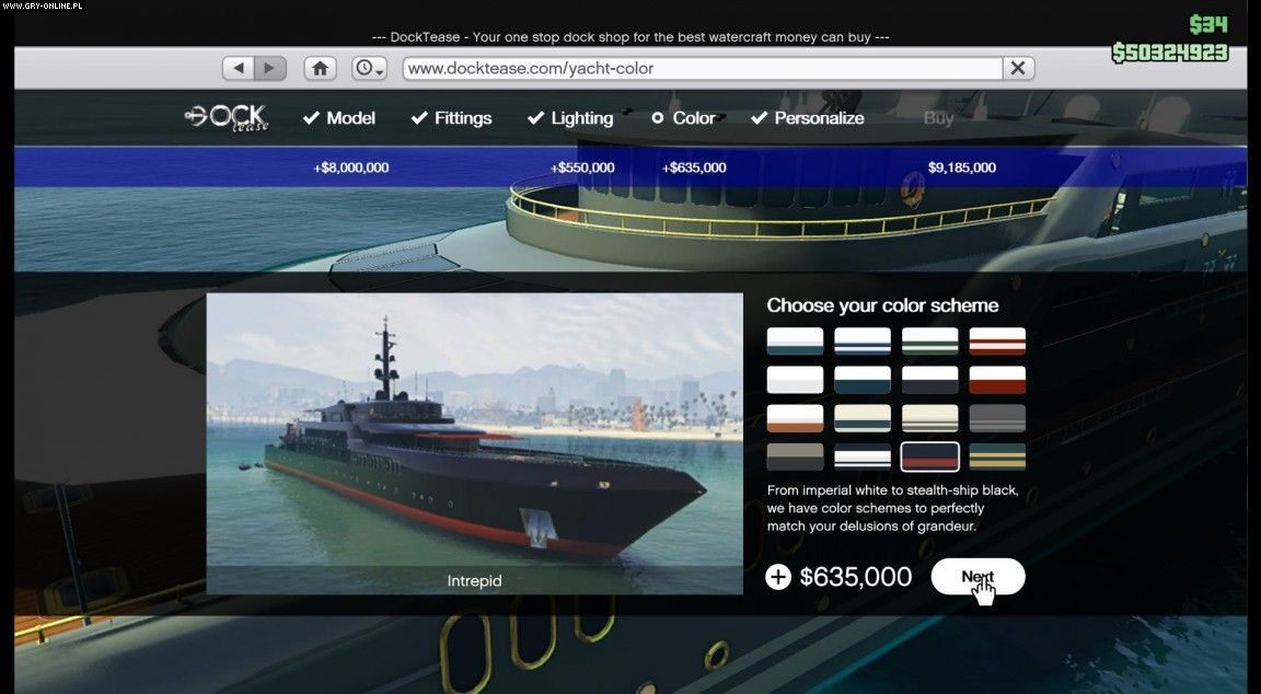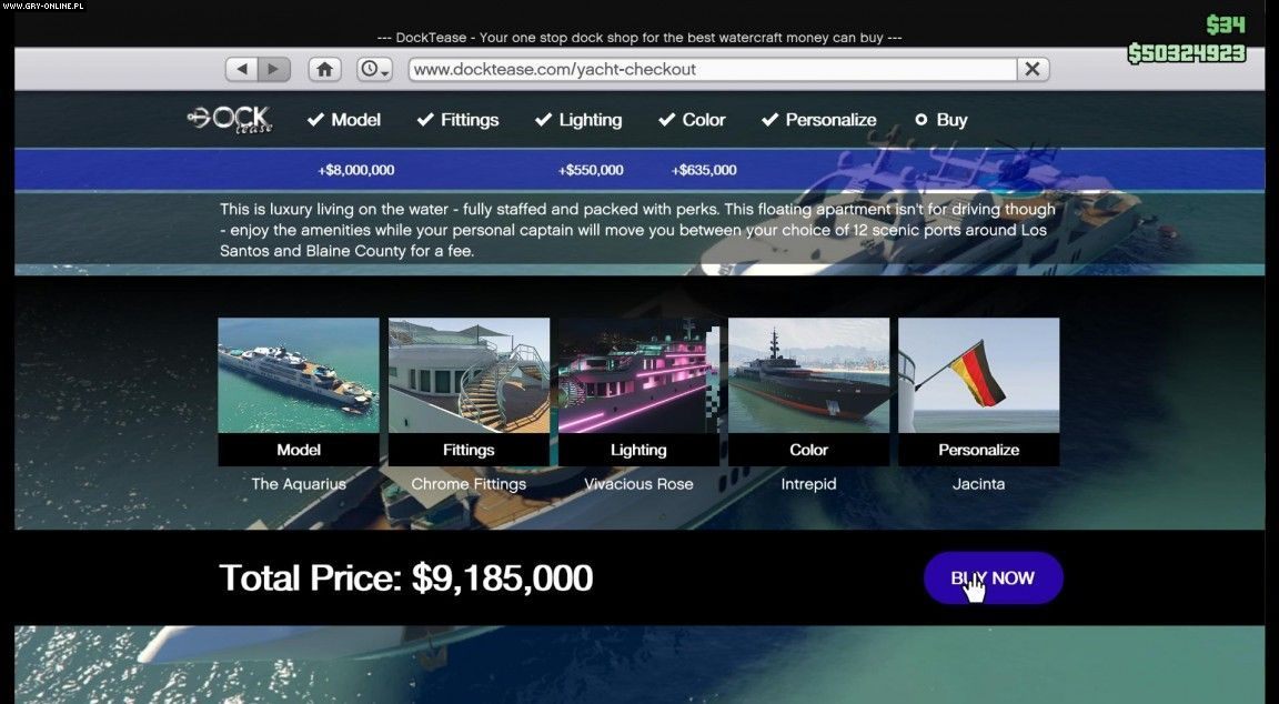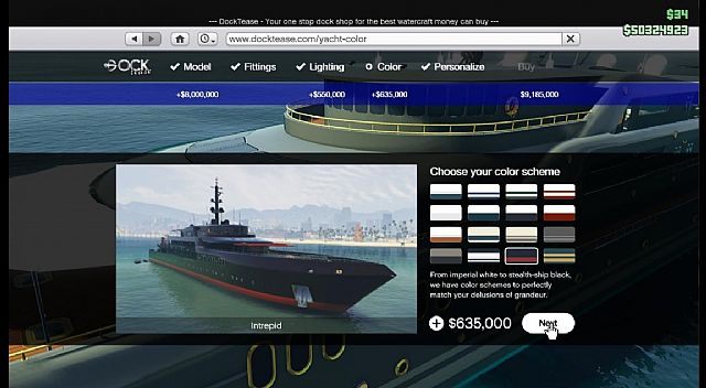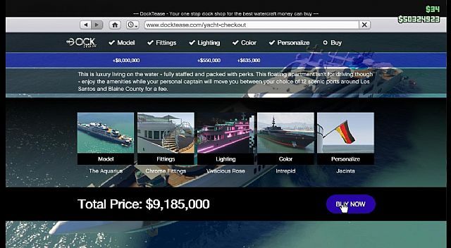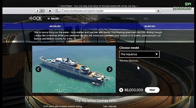 Jacht występuje w trzech wariantach różniących się ceną i wyposażeniem. Poszczególne modele wyceniono na 6, 7 i 8 milionów wirtualnych dolarów, więc pozwolić sobie na niego będą mogli gracze, którzy dorobili się już znacznej pozycji w świecie gry. Kupno łodzi wraz ze wszystkimi luksusowymi dodatkami wyniesie nad około 10 milionów dolarów. Oczywiście statek jest w dużej mierze modyfikowalny i możemy go dostosować do własnych preferencji. Gracze, który nie preferują życia na jachcie, jednak również lubią pławić się w luksusach, mogą zainwestować w kupno palafitu, czyli domu wzniesionego na platformach opartych na palach w Vinewood Hills.
