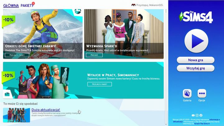 Po uruchomieniu The Sims 4 po ostatniej aktualizacji można doświadczyć niemałego szoku. Ukaże się nam bowiem całkiem nowe menu główne. Całość podzielono na dwie osobne podstrony. W zakładce „główna” zamieszczone zostały informacje o najnowszych wydarzeniach powiązanych z produkcją (np. promocjami czy aktualizacjami). W „pakietach” można zobaczyć wszystkie rozszerzenia, które trafiły do gry, wraz z wyróżnieniem tych przez nas posiadanych. Same ikonki symbolizujące poszczególne DLC zastąpiono natomiast okładkami.