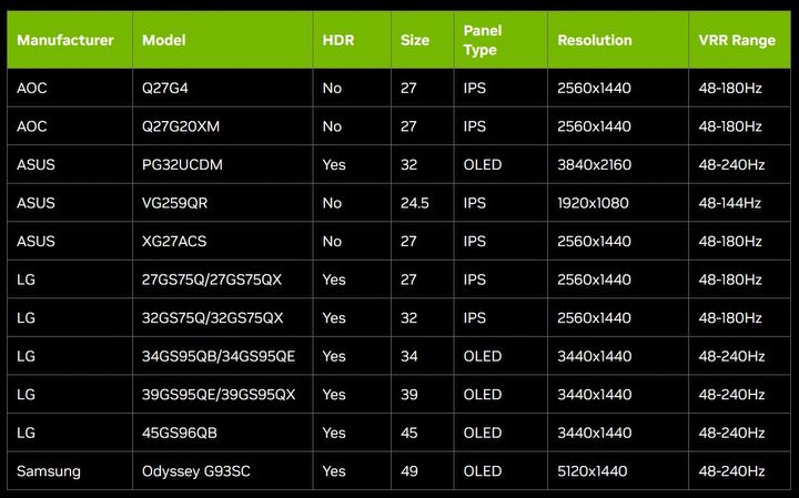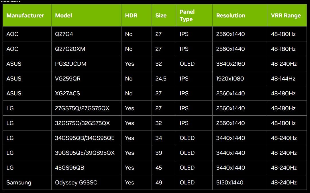 Dodatkowo nowa wersja sterowników wprowadza obsługę dla 11 kolejnych wyświetlaczy zgodnych z G-Sync. Na liście znalazły się modele od AOC, ASUS-a, LG oraz Samsunga. Oto, jak prezentuje się ona w całości: