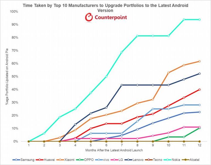 Wykres wskazuje, jak wiele czasu potrzebują producenci, aby zaimplementować najnowszą wersję systemu / źródlo: Counterpoint Research.