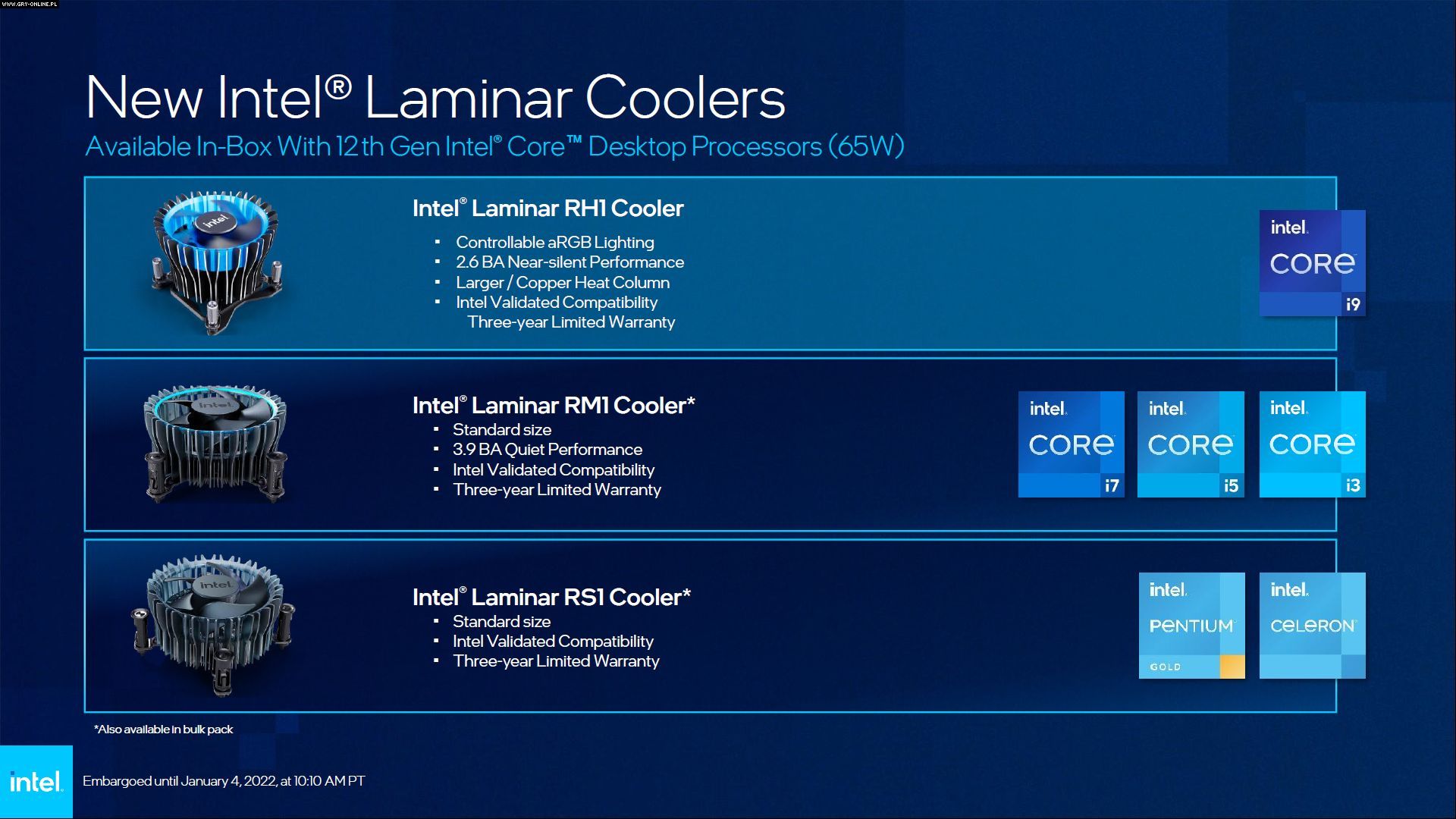 Przy okazji targów CES 2022 Intel zaprezentował kolejne 22 procesory z rodziny Alder Lake. Naturalnie wspierają one zarówno pamięci DDR4 (z taktowaniem 3200 MHz), jak i DDR5 (4800 MHz) oraz standard PCI-Express 5.0. Co ciekawe, 65-watowe CPU otrzymają również nowe chłodzenie.