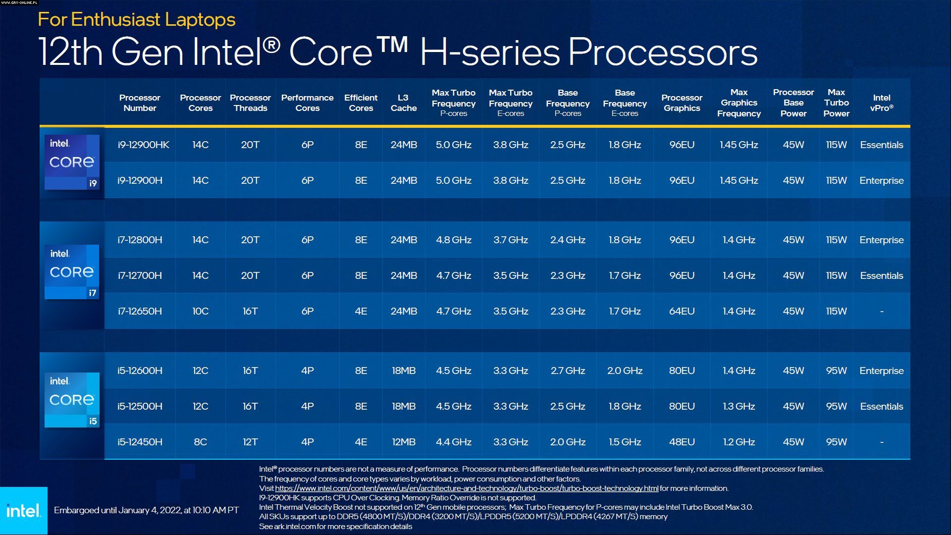 i9-12900HK ma wyjść zwycięsko również z pojedynku z układami firmy Apple nastawionymi na tworzenie treści – w tym z mocarnym M1 Max. Jednostki laptopowe z rodziny Alder Lake obsługują pamięci DDR4 (3200 MHz) lub DDR5 (4800 MHz) oraz LPDDR4x (4267 MHz) albo LPDDR5 (5200 MHz). Dodatkowo wspierają PCI-Express 4.0, technologię Thunderbolt 4 oraz Wi-Fi 6E.