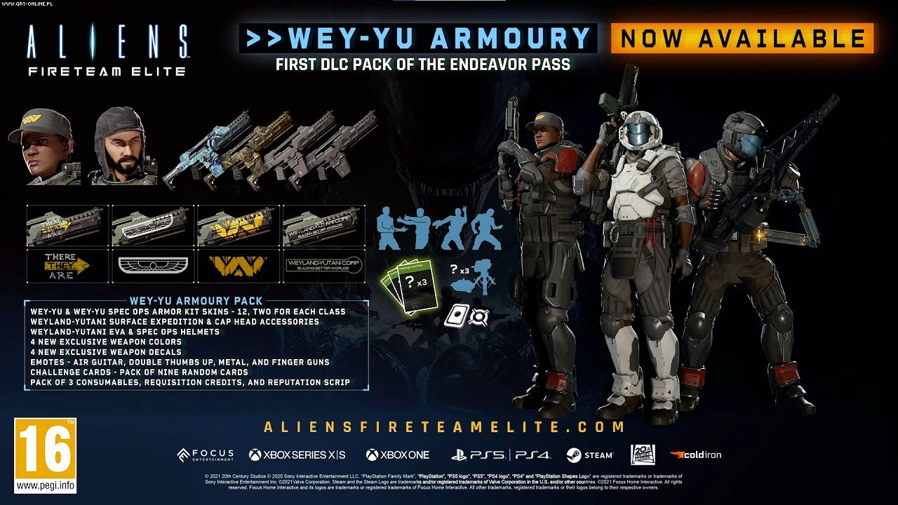 Dla zainteresowanych Cold Iron Studios oferuje też DLC Wey-Yu Armoury za 39,99 zł (Steam; jest też dodawane do Edycji Deluxe). Jego zawartość to 12 skórek do zestawów, cztery kalkomanie na broń, cztery emotki oraz trzy pakiety kart wyzwań. Więcej szczegółów znajdziecie na oficjalnej stronie gry Aliens: Fireteam Elite.