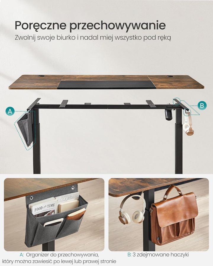 Biurko od Songmics wyposażone zostało nie tylko w panel sterowania, który zapamięta do czterech ustawień wysokości. Mebel oferuje też trzy haczyki do umieszczenia w dowolnym miejscu. To idealne rozwiązanie, jeśli chcesz powiesić plecak lub słuchawki przy biurku. Do tego dorzucono specjalną kieszeń na książki i dokumenty, dzięki której zachowasz absolutny porządek.