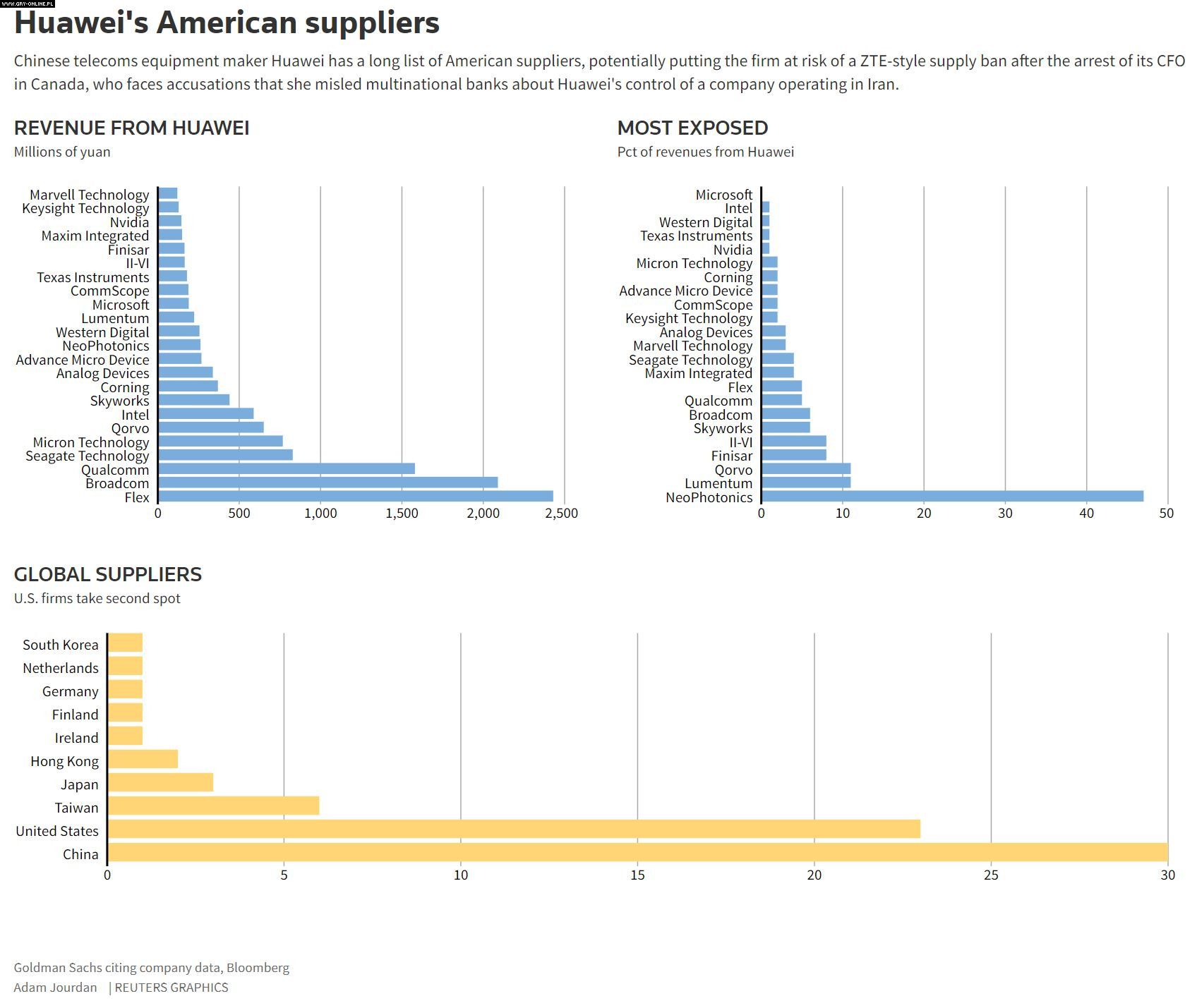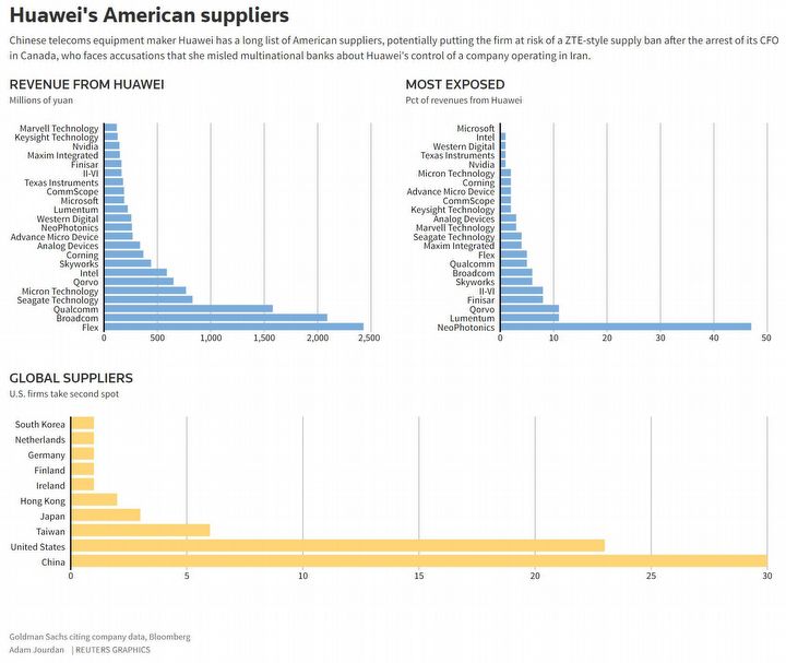 Analitycy firmy Goldman Sachs przedstawili zestawienie amerykańskich firm, które ucierpią na zakazie handlu z chińskim koncernem Huawei. Na liście znalazło się sporo podmiotów kojarzonych z naszą branżą, takich jak AMD, Intel, Microsoft czy Nvidia.