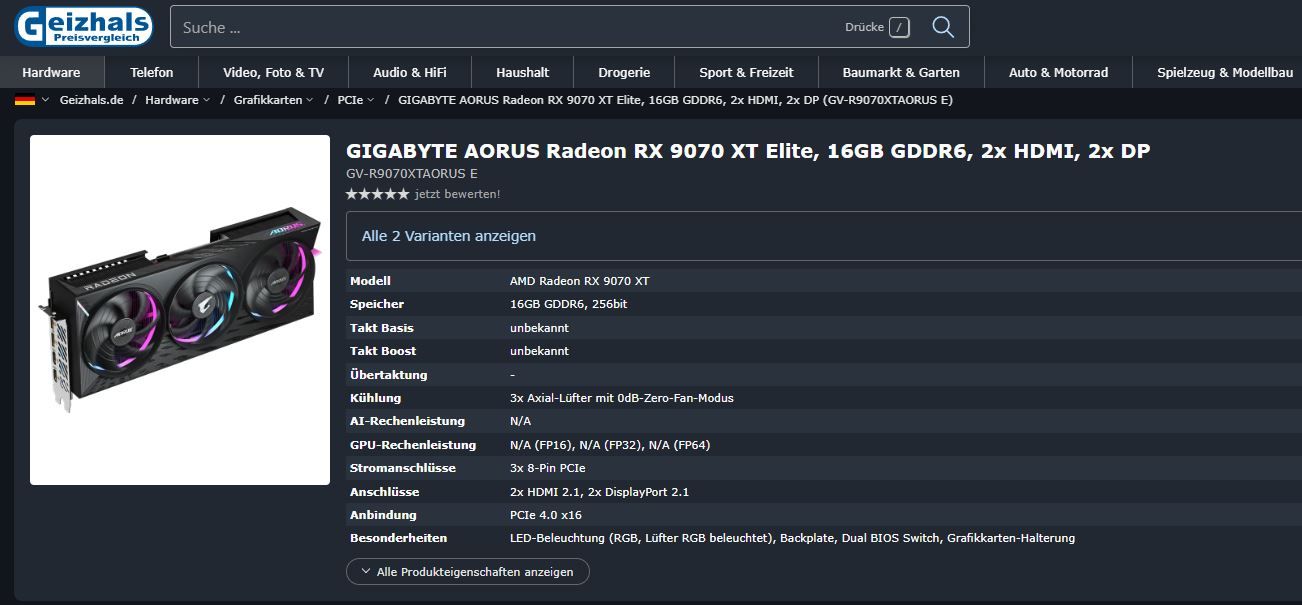 Kolejne informacje zostały opublikowane przez niemiecki sklep Geizhals. W ofercie dystrybutora pojawił się jedynie mocniejszy RX 9070 XT. Omawiany przeciek również potwierdził, że karta będzie posiadać 16 GB pamięci GDDR6. Jako, że RX 9070 XT ma być najmocniejszą kartą w ofercie AMD to możemy spodziewać się, że we wszystkich układach z serii RX 9000 będą instalowane starsze moduły.
