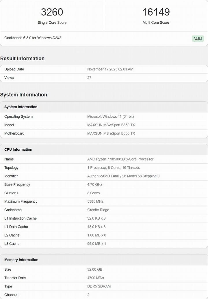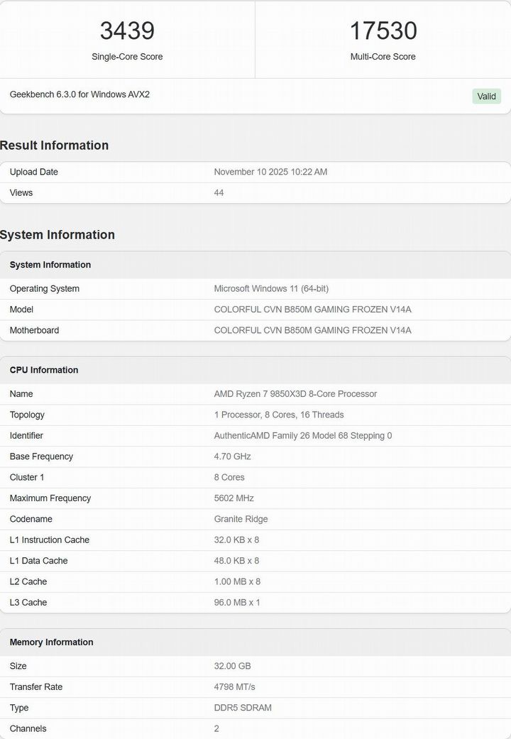Pojawiły się dwa różne benchmarki, z których jeden został wykonany z użyciem płyty głównej Colorful CVN B850M Gaming Frozen 14A, a drugi na płycie Maxsun B850 ITX. W pierwszym przypadku procesor osiągnął 5,6 GHz w trybie boost (poprawa względem Ryzena 7 9800X3D), a przy drugiej płycie wynik ten wyniósł niecałe 5,4 GHz.
