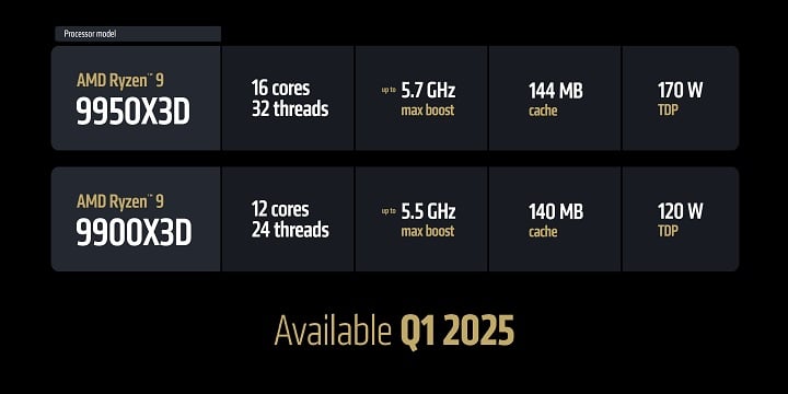 Specyfikacja Ryzenów z serii 9000X3D. Źródło: AMD.